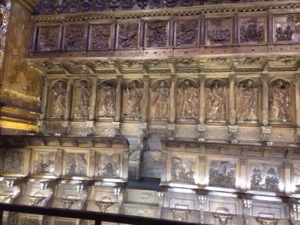 The statues above are of course Santiago and San Millán, busily fighting to thrash the moors many hundred years after their deaths. We went into the choir, behind the altar and here is the main Retalbo from the back.